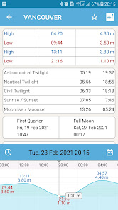 Canada Tides menunjukkan waktu pasang, ketinggian pasang, waktu cahaya pertama / terakhir, waktu matahari terbit / terbenam, dan fase bulan untuk lebih dari 900 lokasi di seluruh Kanada.