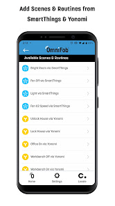Setelah Anda memasangkan OmniFob dengan aplikasi dan terhubung ke hub dan perangkat yang kompatibel, perangkat dan rutinitas / adegan muncul di aplikasi Keyport untuk Anda pilih. Setelah dipilih, ini muncul di OmniFob untuk Anda kontrol.