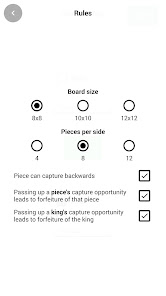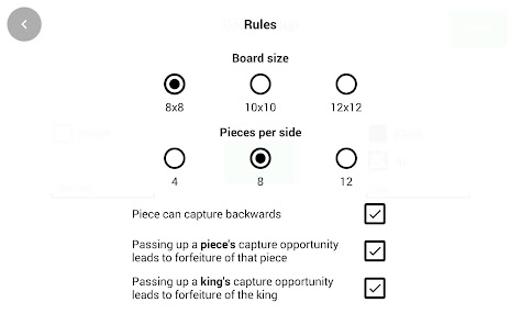 You can choose the size of the board, either 8x8, 10x10 or 12x12. Depending on your preferences, you can also choose the number of pieces on the board and other rules which can be found in the game rules section.