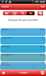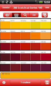 Warna yang dipilih (kecuali Metallics) muncul langsung di layar pada perangkat Android, termasuk nomor referensi dan nilai-nilai RGB.