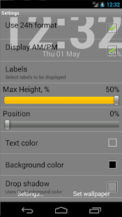 Jam wallpaper sederhana dengan hari ini minggu, tanggal, nama jaringan WiFi, waktu alarm berikutnya, dan status baterai. Memori minimal dan konsumsi baterai. Gambar latar belakang juga dapat disesuaikan. Opsi lainnya akan ditambahkan pada akhirnya tanpa versi Iklan atau 'premium saja'.