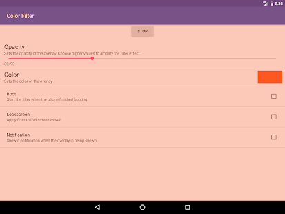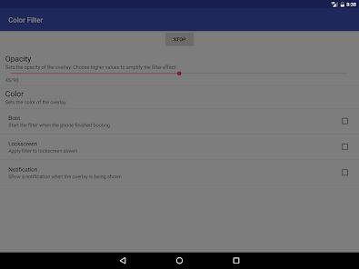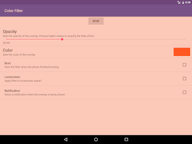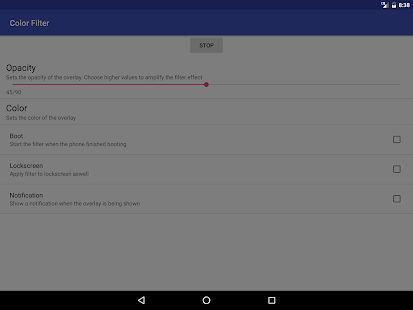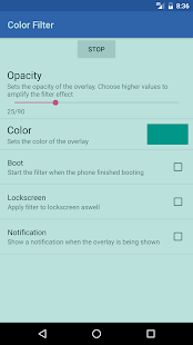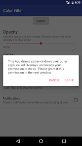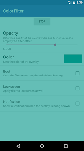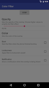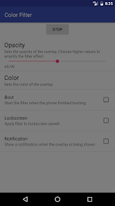 Aplikasi ini menunjukkan overlay (selalu di atas jendela) menunjukkan warna yang dipilih oleh Anda yang meredup layar atau filter warna nya. Hal ini dapat membantu malam untuk bersantai mata Anda seperti kebanyakan ponsel layar dapat cerah dan permantly dapat merusak mata Anda saat menatap ke panjang sementara itu gelap di sekitar Anda.