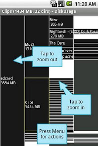 DiskUsage menyediakan cara untuk menemukan file dan direktori pada kartu penyimpanan yang menghabiskan banyak ruang. Menampilkan diagram dengan direktori / subdirektori yang proporsional dengan ukurannya.