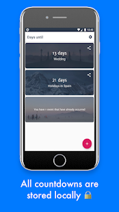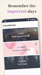 Kami mengambil pendekatan yang berbeda saat membuat kalender dan aplikasi acara mendatang. Buat acara dan lihat sekilas berapa hari tersisa hingga hitungan mundur Anda. Sempurna untuk melacak ulang tahun, pernikahan, liburan, atau apa pun yang dapat Anda bayangkan!