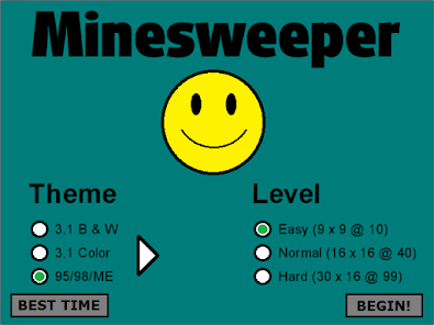 Ada banyak desain tema (seperti komputer lama Anda) dan ada 3 level: Mudah (dengan 10 ranjau), Normal (dengan 40 ranjau) dan Keras (dengan 99 ranjau)