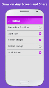 Aplikasi papan gambar ini membantu untuk menambahkan teks, menambahkan stiker, menambahkan gambar dari galeri atau kamera, juga menambahkan bentuk yang berbeda untuk menandai teks atau gambar di layar ponsel Anda dan mengambil screenshot gambar Anda dan membaginya dengan situs sosial.