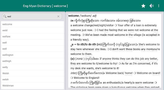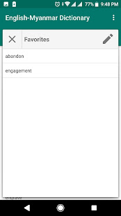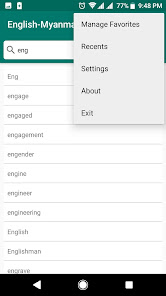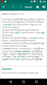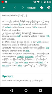 * Kamus Inggris - Myanmar adalah kamus offline Bahasa Inggris ke Myanmar. Kamus ini memberikan hasil kamus dan sinonim dan juga menyediakan suara, bookmark, fitur terbaru.