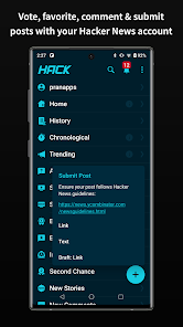 HACK untuk Berita Peretas adalah cara paling indah dan mudah untuk membaca tentang pemrograman, startup, sains, teknologi, teknik, dan berita matematika terbaru. Dengan kemampuan untuk memilih, favorit, komentar, mengirim posting baru dan menerima pemberitahuan push untuk balasan, HACK sangat dapat disesuaikan dengan fitur terbaik yang Anda harapkan di klien kualitas terbaik.