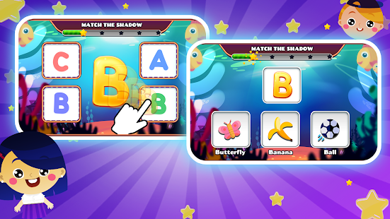 "Mencocokkan Bayangan!" - Seret dan lepas surat ke bayangannya, yang meningkatkan keterampilan motorik halus dan tiga objek yang relevan akan muncul dengan cara yang menyenangkan.