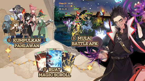 ■Game pertempuran otomatis dengan 5 pahlawan dan magic scroll