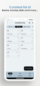 Apakah Anda ingin mendokumentasikan kehidupan sehari-hari Anda atau hanya membutuhkan tempat untuk melampiaskan dan mengeluarkan emosi Anda, Graphite siap membantu Anda. Sesuaikan tampilan dan nuansa buku harian Anda dengan berbagai sampul warna-warni dan , dan bahkan setel pengingat untuk memastikan Anda tidak pernah lupa menuliskan pemikiran Anda. Tambahkan foto ke entri Anda untuk menjadikannya lebih personal. Buat tag khusus dan kategorikan agar entri Anda mudah dicari dan diatur.
