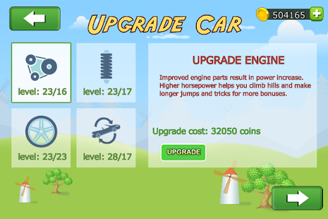 Control your car or bike to climb hills with most realistic control to face the challenges of unique uphill & downhill environments. Gain bonuses from tricks and collect coins to upgrade your car and reach even higher distances.