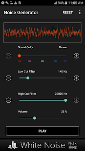 Drag the Sound Color slider to select brown, pink, white, blue, violet, or somewhere in-between. Next, drag the low and high cut filters to further customize to your liking. Adjust device volume using the on-screen volume slider to a comfortable level. Toggle audio playback using the Play/Pause button.