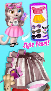 Tapi pertama-tama, bantu Amy bersiap-siap! Dia harus terlihat sempurna di depan klien kucingnya. Pilih tatanan rambut yang sempurna dan dandani dia dengan pakaian penata rambut yang cantik! Jangan lupa untuk mendekorasi salon kecantikan! Cat dinding dengan warna-warna panas, tambahkan beberapa pola dan gaya yang menyenangkan dengan cermin berbentuk kucing, kelinci, atau berlian yang menggemaskan!