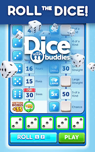 Di Dice With Buddies, tujuan permainan ini adalah untuk mencetak poin terbanyak dengan menggulirkan kombinasi yang berbeda. 5 dadu Anda dapat digulung hingga 3 kali per giliran untuk mencetak skor dalam suatu kategori. Setelah kategori digunakan dalam game, kategori tidak dapat digunakan lagi. Permainan ini terdiri dari tiga belas putaran. Merasa beruntung? Lempar lemparan lima jenis dan cetak 50 poin! Cetak poin lebih banyak dari lawanmu untuk memenangkan permainan dan dapatkan hadiah!