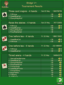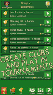 In Tournament Bridge you play at your own pace against players from around the world in duplicate style Bridge tournaments. Each player in a tournament plays the same hands with the winner scoring the most points. Alternatively you can easily create your own online Bridge club, invite your family, friends or even some enemies then play in duplicate style Bridge tournaments against your own select set of players.