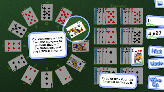 Build the clock face up by suit until the correct hours show! Re-arrange the tableaux in descending order to dig out the hour-cards and use the 'Thirteenth' hour to store a card if you get stuck! Once you get the hang of it, try taking on Expert mode with lots of hidden cards!