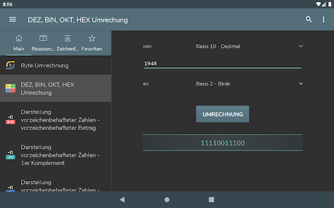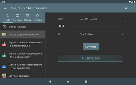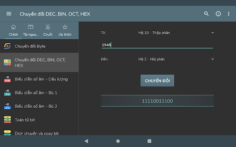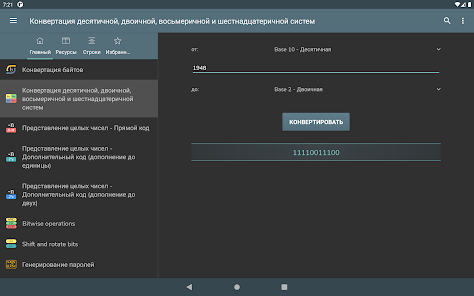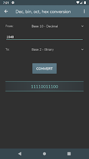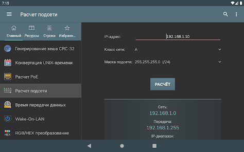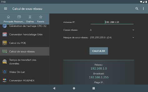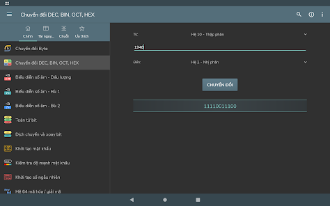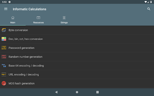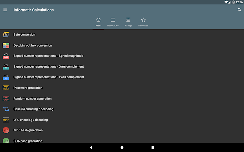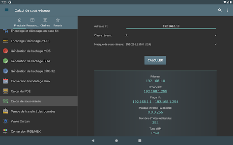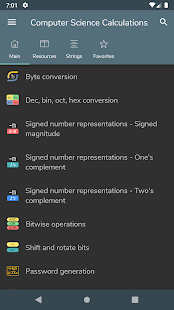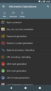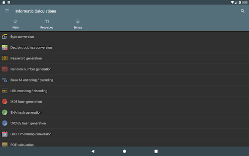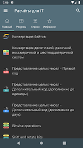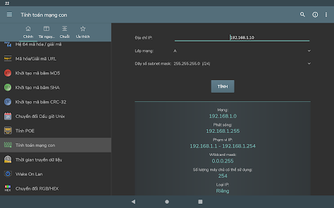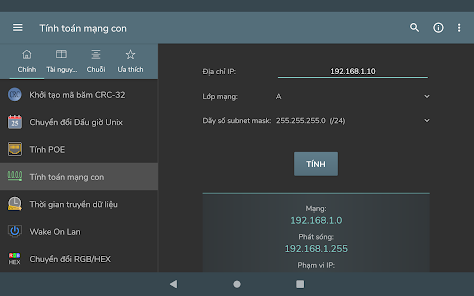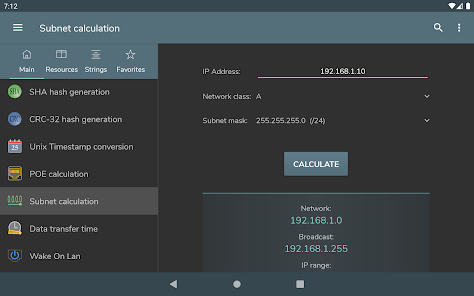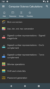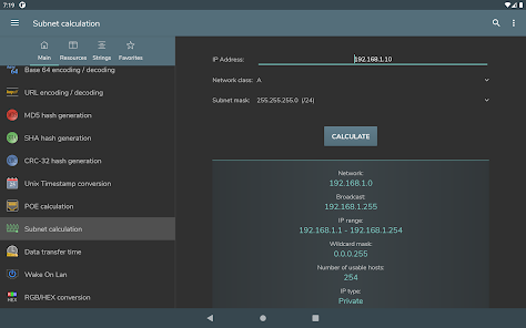Konversi byte - Konversi Des, bin, okt, hex - Representasi angka bertanda: Magnitudo bertanda, Komplemen satu, Komplemen dua - Operasi bitwise - Menggeser dan memutar bit - Pembuatan kata sandi - Pemeriksaan kekuatan kata sandi - Pembuatan angka acak - Pengkodean / dekode basis 64 - Encoding / decoding URL - Pembuatan hash MD5, SHA, CRC-32 - Konversi Unix Timestamp - Perhitungan POE - Perhitungan subnet - Waktu transfer data - Wake on lan - Konversi RGB/HEX